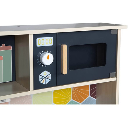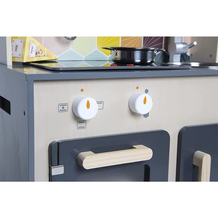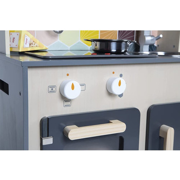 На большой кухне, выложенной мозаикой из дерева, есть крючки, на которые можно повесить 1 шумовку, 1 сковороду, 1 металлический дуршлаг и 3 коробки с едой из картона (сыр, мука, рис). Как и настоящая кухня, она оборудована индукционной плитой со светодиодной подсветкой и настоящими звуковыми эффектами. Просто нажмите красные кнопки один раз, чтобы включить тарелки, а затем второй раз, чтобы услышать звук кипящей воды в кастрюле.