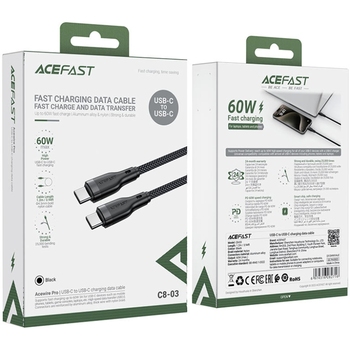 Кабель USB 2.0 USB-C to USB-C довжиною 1,2 метра від Acefast, модель C8-03, є надійним аксесуаром для заряджання та передачі даних між пристроями з роз'ємами USB-C. Цей кабель підтримує потужність до 60W, що дозволяє ефективно заряджати ваші пристрої. Зручна довжина кабелю дозволяє підключати пристрої на відстані і забезпечує зручність в користуванні. Кабель C8-03 від Acefast виготовлений з високоякісних матеріалів, що забезпечує його міцність і довговічність. Цей кабель ідеально підходить для повсякденного використання вдома, в офісі або під час подорожей. Він дозволить вам ефективно зарядити ваші пристрої та передавати дані між ними з надійністю. Якщо вам потрібен надійний і функціональний кабель для зарядки вашого пристрою з портом USB-C, кабель Acefast C8-03 буде ідеальним вибором для вас.
