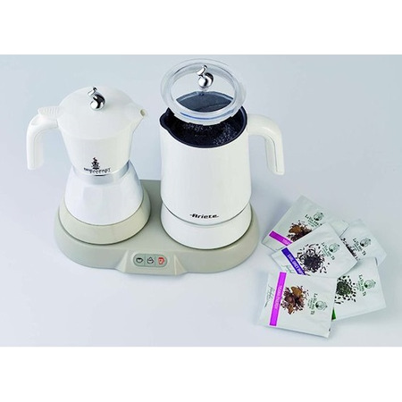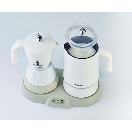 З потужністю під'єднання 500 Вт ARIETE забезпечить одночасну роботу двох приладів. При цьому кавоварка об'ємом 0.3 л дозволить зварити від 2 до 4 порцій напою за один цикл приготування. Спінювач створить до 140 мл збитого молока або закип'ятить 250 мл рідини. З можливістю підігріву води до певної температури набір порадує широким потенціалом у використанні. Асортимент напоїв не обмежується тільки лише кавою або чаєм. Користувач зможе за лічені миті приготувати зелений чай при температурі 80 °С, холодний кавовий напій або навіть молоко з фруктовим соком. ARIETE 1344 стане ідеальним рішенням для кухні будь-якої сучасної господині.