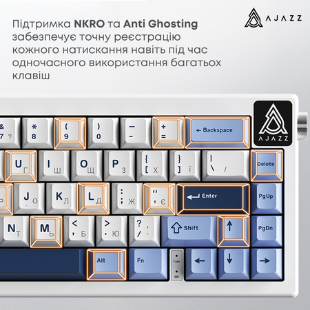 Ajazz AK650 подключается через кабель длиной 1,6м, обеспечивая стабильную работу без задержек. Кастомизированная Gasket-структура уменьшает вибрации и шум, делая набор более мягким и равномерным.