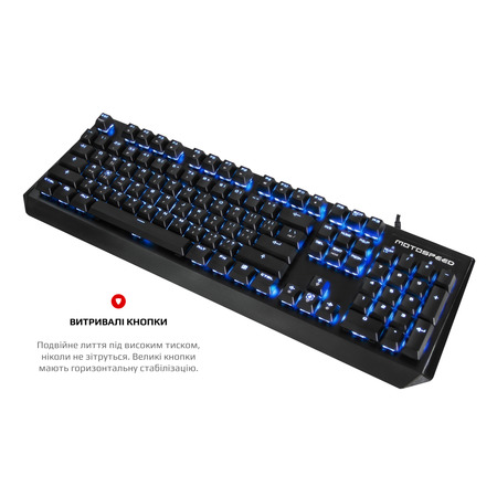 Выполнены за технологию двойного литья под высоким давлением с подвесной крепью, что придает непревзойденную износостойкость и гарантирует продолжительность жизни более 50 миллионов нажатий клавиш. Большие кнопки имеют двойной подвес и горизонтальную стабилизацию.