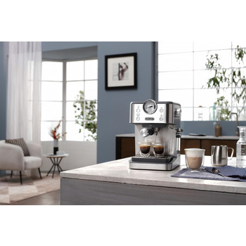 Кофеварка совместима с молотым кофе, поддерживает систему «Капучино» для взбивания молока и оснащена функцией подогрева чашек. Для безопасности и удобства предусмотрено автоматическое отключение, а также программирование объема порции. Корпус из нержавеющей стали подчеркивает надежность и современный стиль устройства.