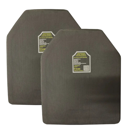 В плитах використовується бронесталь найкращого виробника у світі – шведського концерну SSAB, Armox Advance твердістю 58-63 HRC з номінальною товщиною 6 мм! Правильна обробка цієї сталі дозволила виготовити плити, що відповідають 5 класу ДСТУ. Але це ще не все. Додали на плити унікальну розробку – бокове торцювання. Цей матеріал має щільність 800 кг/м3! Кожну плиту ми пресуємо з торцюванням у спеціальному пристрої, де залишаємо її на півтори години. Цей метод дозволив зчепити повсть з металом та змусити їх працювати як єдине ціле, майже унеможлививши боковий виліт осердя при влучанні в край нашої бронеплити. Позаду кожної плити встановлюємо пом'якшуючий демпфер з матеріалу EVA товщиною 8 мм та щільністю 80 кг/м3. На відміну від стандартного демпферу зі спіненого поліетилену або каучуку щільністю 30–35 кг/м3 демпфер майже не деформується з часом експлуатації та демонструє кращі результати по зменшенню заперешкодної травми.