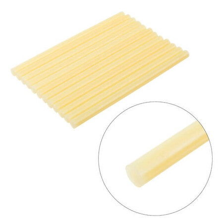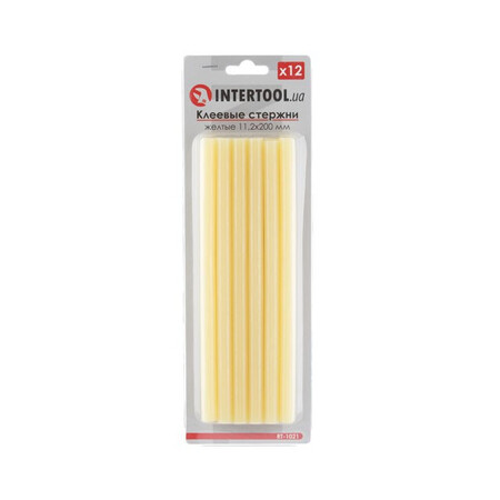 Комплект прозорих клейових стрижнів INTERTOOL RT-1021 - витратний матеріал для клейових пістолетів. Клейові стрижні INTERTOOL RT-1021 застосовуються для скріплення дерева, кераміки, пластмас, тканини, металу та проводів, а також інших матеріалів в різних поєднаннях. Стрижні виготовлені з високоякісної сировини марки Dupont. Завдяки цьому, високов'язкий клей дозволяє надійно скріплювати перераховані матеріали. В комплект вагою 0,275 кг входить 12 жовтих клейових стержнів.