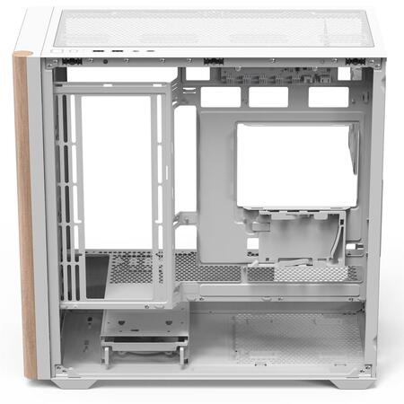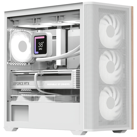 Откиньтесь на спинку кресла и наслаждайтесь одним из наших первых корпусов для ПК с деревянным акцентом, изысканным, разработанным для создания естественной атмосферы на вашем рабочем столе.
