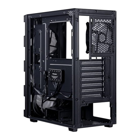 Это современный полноформатный вертикальный корпус для стационарного компьютера, выполненный в форм-факторе Midi Tower. Имеет небольшие размеры для своей категории (395х195х450 мм), эффектный дизайн с ARGB-подсветкой, а также отличную «продуваемость», позволяющую собирать холодные и производительные сборки, без ограничений по комплектующим.