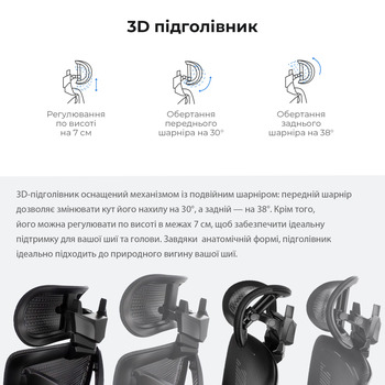 Кресло оснащено 4D подлокотниками, 3D подголовником и 8-сантиметровой регулировкой высоты спинки с 7 уровнями, что позволяет настроить комфорт и поддержку в соответствии с вашими потребностями.