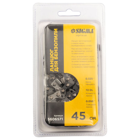 Ланцюг для бензопили 45см крок ланцюга 0.325 паз 1.5мм 72DL SIGMA (5606571) призначений для різання деревини та інших матеріалів. Він складається із зубів, які обертаються навколо напрямної шини, створюючи силу, яка ріже матеріал.