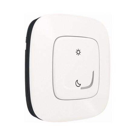 <Умный беспроводной выключатель сценариев "День/Ночь" является элементом системы домашнего комфорта Legrand. Для его работы нужно предварительно купить и установить стартовый пакет умного дома. Умный беспроводной выключатель сценариев "День/Ночь" позволяет задавать сценарии работы системы на периоды Вашей активности и отдыха. Например, утром одним нажатием клавиши поднимаются рольставни, включается освещение, подключенное к источнику питания на радиоприемник или телевизор. Сверхтонкий выключатель можно переставить в другое место в любое время.