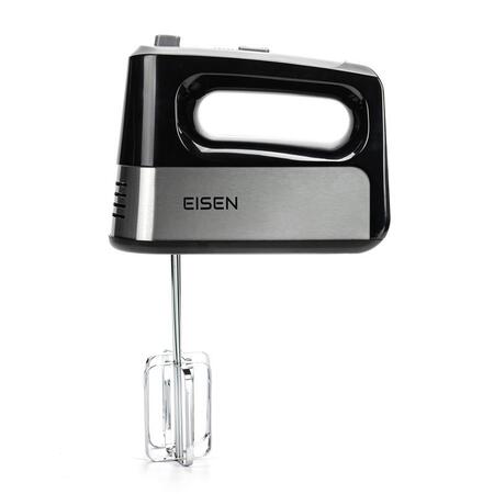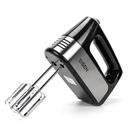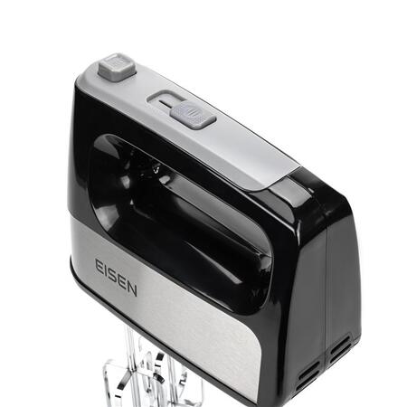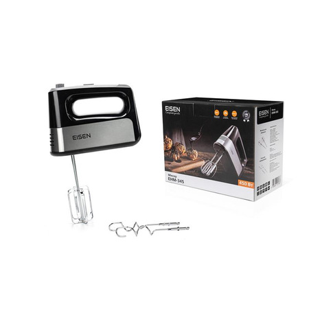Современная модель EISEN EHM-345 представлена в черном цвете. Корпус миксера изготовлен из качественного пластика, а венчики для взбивания и крюки для теста – из нержавеющей стали.