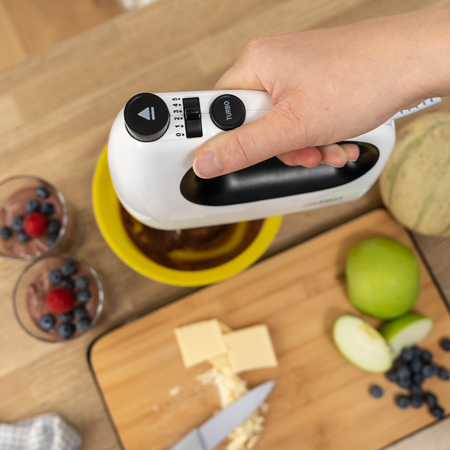 Техника имеет 6 основных скоростей, переключаясь между которыми вы сможете подобрать оптимальный уровень воздействия в каждом конкретном случае. При этом также есть выделенная кнопка для активации турборежима. Он задействует весь ресурсопотенциал миксера, придав насадкам максимальный крутящий момент.