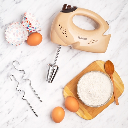 Мощность составляет 300 Вт, что обеспечивает быструю и качественную работу. Миксер имеет 5 скоростных режимов для взбивания. Функция "Турбо" позволяет ненадолго значительно увеличить скорость вращения, она особенно важна при быстром разбивании комков в тесте.