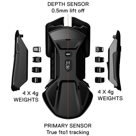 Миша має 7 програмованих кнопок і систему налаштування ваги. У комплекті йдуть вісім вантажів по 4 грами, які можна розмістити з боків корпусу, щоб збалансувати вагу та змістити центр мас, що дозволяє адаптувати мишу під будь-який хват та стиль гри.