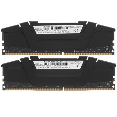 Планки ОЗУ комплекта G.Skill RIPJAWS V [F4-3600C16D-32GVKC] 32 ГБ отличаются высотой 41 мм и предполагают работу при входном напряжении 1.35 В. Модули имеют тайминги 16-19-19-39 и располагают черными радиаторами, которые установлены над чипами памяти и печатными платами. Благодаря этим стильным теплоотводам происходит более продуктивное рассеивание выделяемого планками тепла.