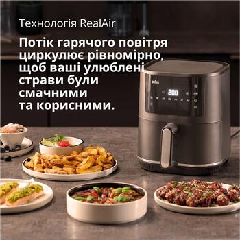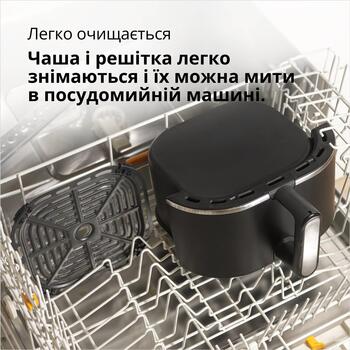 Маленький и малогабаритный дизайн. Разработана для того, чтобы занимать минимум пространства, что делает его идеальным для небольшой кухни. Выдвижная чаша объемом 4,3 л обеспечивает достаточную емкость для приготовления разнообразных закусок, гарниров и полноценных блюд, например 1,2 кг курицы или 1 кг замороженного картофеля фри.