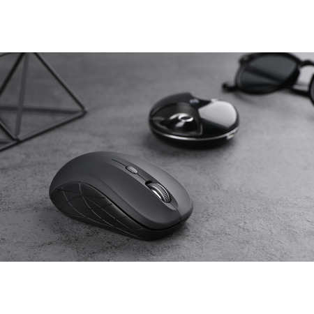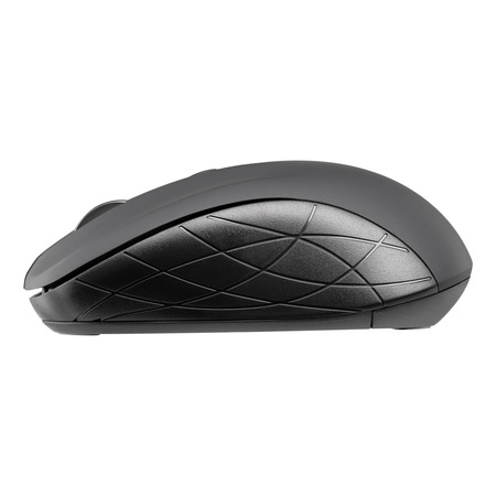Беспроводная эргономичная мышь из матового пластика обеспечит комфортную работу в течение длительного времени. Выполнена в классическом дизайне в черном цвете и с геометрическими вставками на боковых сторонах мыши. Скорость курсора настраивается под собственные требования: 800, 1200 или 1600 DPI.