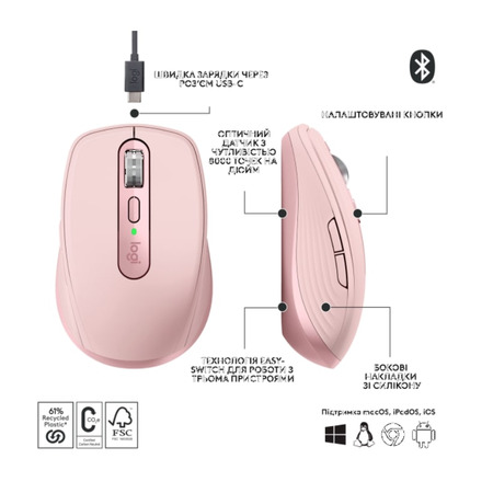 При полной зарядке батареи, мышь MX Anywhere 3S может работать до 70 дней, а быстрой зарядки в течение одной минуты хватит на три часа работы.