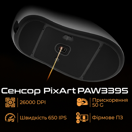 Сенсор PixArtPAW3395: ER21 оснащен высокопроизводительным оптическим сенсором PixArt PAW3395, поддерживающим до 26 000 DPI, скоростью 650 IPS и ускорением до 50g.