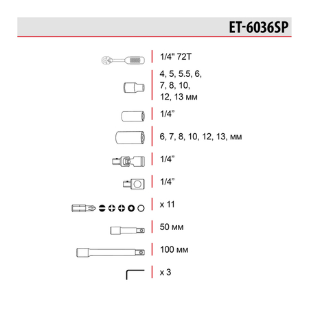 Набор с комплектацией в 36 единиц включает трещотку с посадочным квадратом 1/4", набор шестигранных головок от 4 до 13 мм, головки средней длины 6-13 мм для работы с креплениями в глубоких колодцах двигателей.
