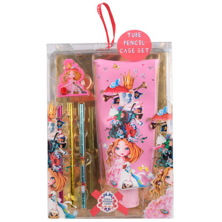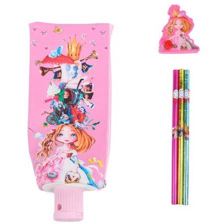 Набір включає пенал для канцтоварів з точилкою на кінці, 3 олівці, гумку