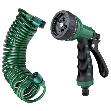 Набір поливальний: шланг спіральний 7.5м + пістолет-розпилювач 7-ми режимний GRAD (5019065) призначений для спрямованого поливу присадибних ділянок, городів, клумб, газонів і т.д. Сумісний з усіма елементами поливальної системи і може комбінуватися з необхідними пристроями і насадками за бажанням користувача.