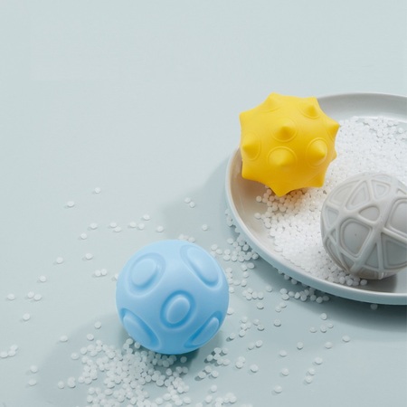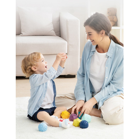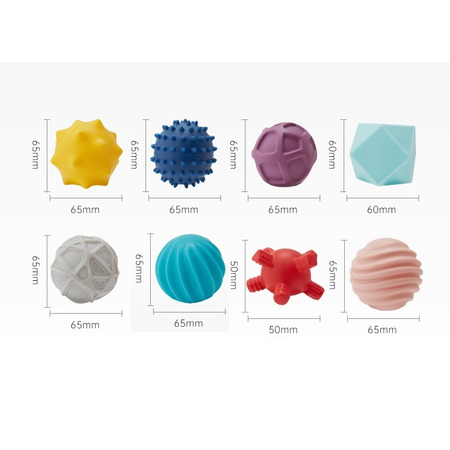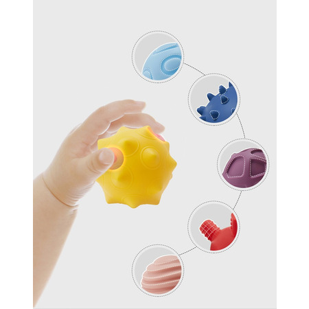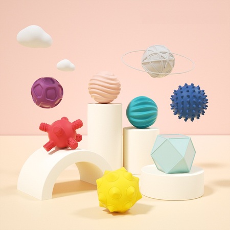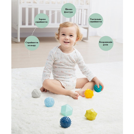 Мячики можно грызть и использовать, как прорезыватель для зубов. Текстурная поверхность развивает тактильные ощущения. Игра с шарами развивает мелкую моторику, а объемные фигуры заставят ребенка рассматривать детали и фокусировать зрение.