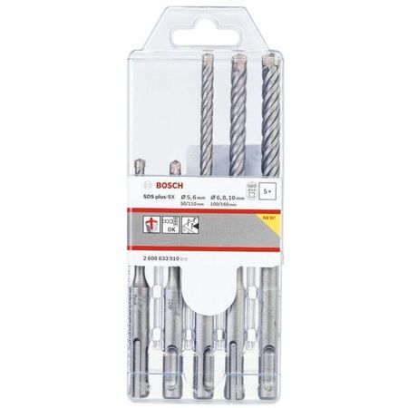 Набор из пяти износоустойчивых сверл Bosch SDS-Plus-5X. Буры с центрирующим острием точно проходят армированный бетон, кирпичную кладку, бетон. Четыре режущие кромки сверла предупреждают его застревание в арматуре. Четыре спирали эффективно отводят пыль.