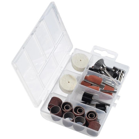 Набор шлифовальных и полировальных принадлежностей из 38 предметов от KWB можно использовать с двойной шлифовальной машиной Einhell TC-XG 75. С помощью различных шлифовальных кругов, шлифовальных роликов и полировальных дисков небольшие шлифовальные и полировальные работы выполняются точно, легко и быстро.