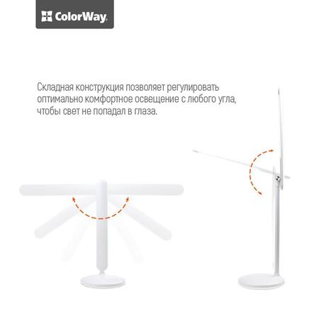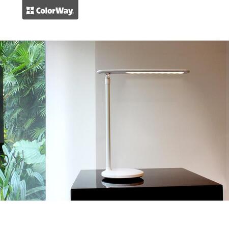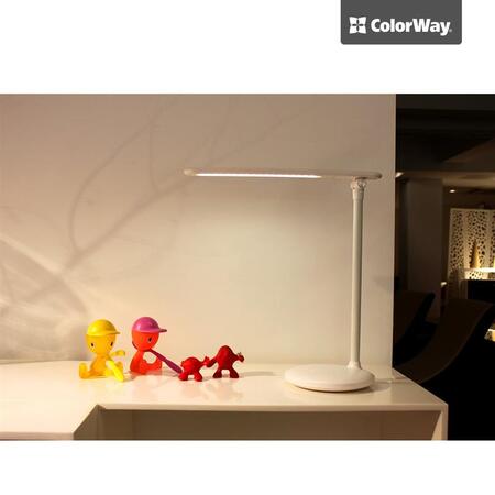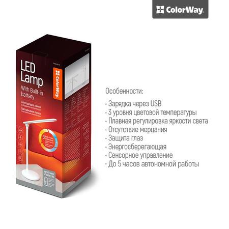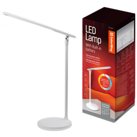 Настольная светодиодная лампа ColorWay со встроенным аккумулятором. Стильный дизайн и функциональные возможности делают лампу ColorWay не только элегантным элементом интерьера, но и незаменимым аксессуаром, помогающим повысить продуктивность и эффективность работы. LED лампа имеет встроенный аккумулятор объемом 1800 mAh, который обеспечивает до 4х часов работы без подключения к сети, зарядить ее можно от любого источника, оснащенного разъемом USB! Для подключения Вам не потребуются дополнительные специальные устройства для зарядки, подойдут разъемы в компьютере, ноутбуке, зарядное устройство для смартфона или PowerBank, это также просто, как зарядить телефон, что делает лампу по настоящему мобильной! Сенсорная кнопка на корпусе обеспечат бесшумное и мягкое управление девайсом. Для обеспечения комфортной работы предусмотрена возможность управления яркостью и цветовой температурой освещения. В зависимости от потребности, пользователь может установить: повышающий концентрацию холодный утренний свет, оптимальный для чтения и учебы нейтральный дневной свет или успокаивающий и снимающий стресс теплый желтый свет. Световые элементы обеспечивают равномерное рассеивание света.