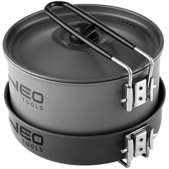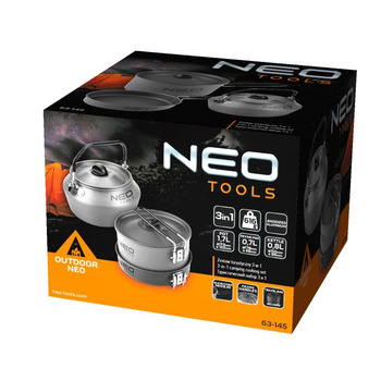 Туристическая посуда 3 в 1 NEO 63-145 - это котелок, сковорода и чайник, предназначенные для кемпинга и приключений на природе. Набор весит всего 616 г, благодаря использованию прочного и легкого материала - анодированного алюминия. Посуда одобрена LFGB для контакта с пищевыми продуктами. Они также оснащены складными практичными изолированными ручками. Объем кастрюли составляет 1,7 литра, диаметр 173 мм и высота 122 мм. Чайник объемом 0,8 л имеет размеры - 152 мм в диаметре и 96 мм в высоту. Сковорода объемом 0,7 л имеет высоту 48 мм и диаметр 178 мм. Это отличный ассортимент туристической посуды от бренда NEO для различных экспедиций.