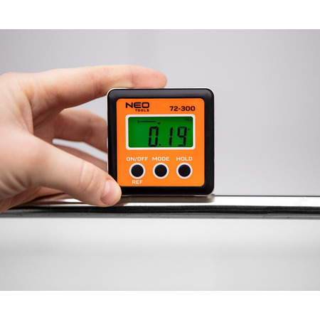 Угломер цифровой NEO, ЖК дисплей, 2 функции REF и HOLD, 4 единицы измерений, точность измерения ±0.1°, магнит в основании, 2хAAA 72-300. Цифровой угломер NEO 72-300 для быстрого и точного измерения углов при строительных, ремонтных и монтажных работах. Особенно полезно устройство при установке стальных конструкций, станков или настройке циркулярных пил.