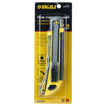 Ніж пластик / гума корпус лезо 3шт 18мм автоматичний замок SIGMA (8211111) призначений для розрізання із застосуванням значних зусиль різних матеріалів: килимових покриттів, картону, тканини, паперу.