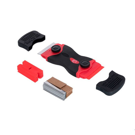 На обох торцях інструмента розташовані змінні леза, пластикове та сталеве. Ширина робочої частини становить – 40 мм. Обидва леза надійно захищені ковпачками, що унеможливлює пошкодження під час зберігання та транспортування ножа-скребка. У комплекті також поставляється по 10 запасних лез кожного виду.