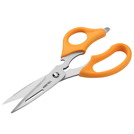 Ножиці універсальні Tolsen довжиною 220 мм виготовлені з високоякісного хром-ванадієвого сплаву (CrV), який відомий своєю міцністю і стійкістю до корозії. Ці ножиці призначені для широкого спектру використання, вони можуть бути застосовані для різання різних матеріалів, таких як папір, картон, тканина, пластик та навіть певні види металу. Завдяки універсальному призначенню ці ножиці стануть в невід'ємним інструментом як вдома, так і на робочому місці.