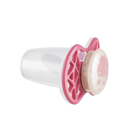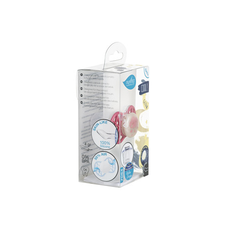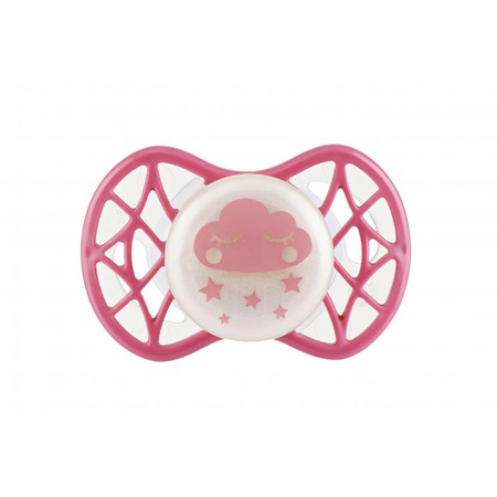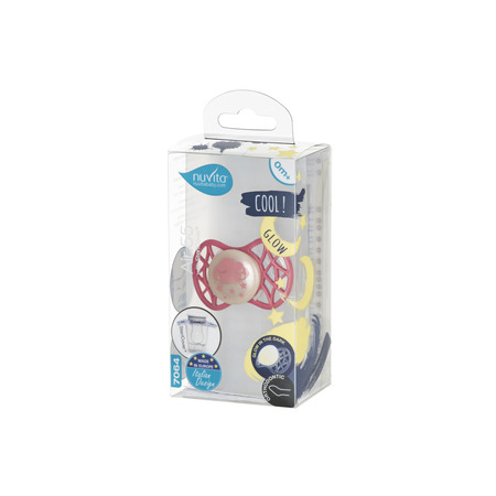 Ортодонтическая пустышка Air55 Cool, которая светиться в темноте. Пластинка соски на 55% состоит из воздуха обеспечивая почти полную аэрацию области вокруг рта, избегая скопления слюны, которая может раздражать кожу. Защитный колпачок для соски для поддержания чистоты соски и стерилизации в микроволновой печи простым добавлением воды.