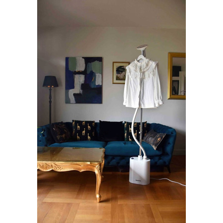 Прибор не занимает много места, но при этом обеспечивает высокую степень удобства при работе. Стильный пластиковый корпус скрывает внутри емкость для воды. Отпариватель можно оставлять на виду, ведь он не может испортить вид комнаты. Зато у вас всегда будет возможность быстро прогладить или освежить нужную вещь перед выходом из дома. А эргономичная стойка с вешалкой позволяет разместить нужную одежду прямо на отпаривателе.
