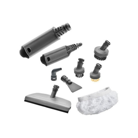точечная насадка, скребок, нейолоновая щетка маленькая и большая, металлическая щетка, насадка и салфетка для мойки окон, насадка для мойки полов, салфетка для насадки для мойки полов, три удлинительные трубки