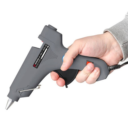 Вам не придется каждый раз отключать термопистолет от электросети. На корпусе расположена кнопка включения/выключения, достаточно просто на нее нажать и излишки клея не будут донимать вас во время длительного процесса склеивания или перерыва в работе.