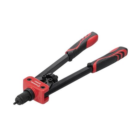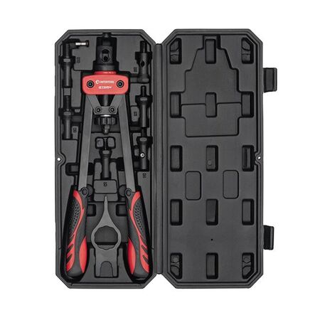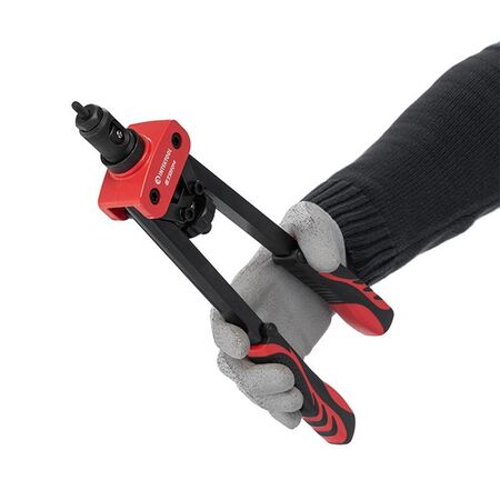 Повністю прогумовані рукоятки з рифленим нанесенням забезпечують надійне захоплення інструмента і протистоять зісковзуванню навіть забруднених рук. Замінити насадки не становитиме особливих труднощів за рахунок простої конструкції фіксатора зі штифтом. При цьому дістати заклепник із забитої нітогайки допоможе спеціальний гвинт з "баранцем", який знаходиться між рукояток, відкрутивши його Ви легко звільните інструмент.