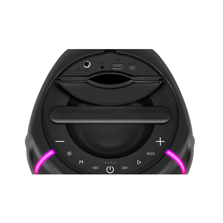 Колонка работает до девяти часов автономно благодаря аккумулятору 33.3 Вт*ч (4500мА*ч), заряжается через USB Type-C, а управление осуществляется как вручную, так и с помощью пульта дистанционного управления.