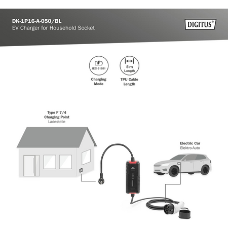 Пристрій DK-1P16-A-050-BL від DIGITUS - це зарядний пристрій для електромобілів з однофазним входом потужністю 3.7 кВт і роз'ємами Schuko та Type 2. Він призначений для заряджання електромобілів у домогосподарствах або на комерційних об'єктах. Цей пристрій дозволяє швидко та ефективно заряджати електромобіль, забезпечуючи безпечну та надійну роботу.