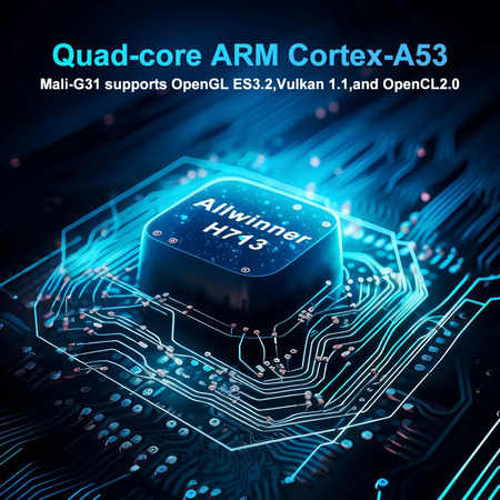 Проектор HY320 имеет на борту 4-ядерный процессор Allwinner H713, видео процессор GPU ARM Mali-G31 (Dvalin), 1 Гб оперативной и 8 Гб встроенной памяти. Разрешение устройства HD (1920х1080), но также проектор позволяет декодировать видео вплоть до 4К. К интернету устройство подключается, через высокоскоростной WiFi 2,4 ГГц или 5 ГГц + поддержка WiFi 6 (802.11ax). Проектор имеет Bluetooth, благодаря которому можно подключить к нему аэропульт, наушники, аудио-колонки и другие беспроводные гаджеты.