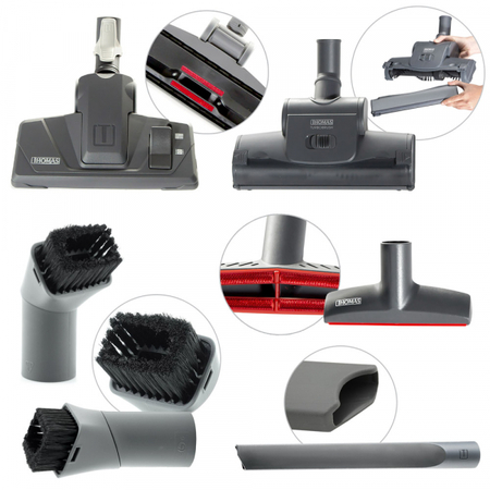 Комплектация пылесоса включает насадки для различных типов поверхностей, что позволяет легко и быстро очистить комнату от любого мусора.