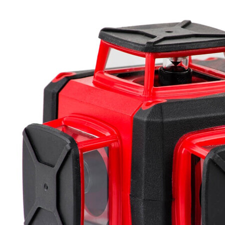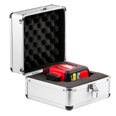 - Лазерный уровень оснащен лазерными излучателями с диапазоном свечения до 20 метров и точностью ± 0,5 мм/м.