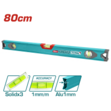 Рівень алюмінієвий TOTAL TMT28016 застосовується в будівельних та оздоблювальних роботах для визначення рівності поверхні. Рівень виготовлений з алюмінієвого профілю з трьома вічками. Товщина профілю - 1 мм, довжина рівня - 800 мм, точність - 1 мм/м.