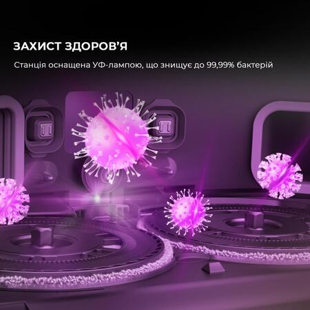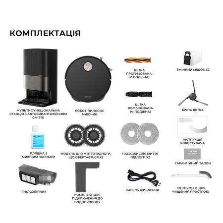 боковая щетка, бутылка с моющим средством, вращающийся модуль для мойки пола х 2, гарантийный талон, инструмент для чистки устройства, кабель питания, комплект для подключения к водопроводу, мультифункциональная станция с автовыгрузкой мусора, насадки для