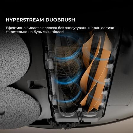 HyperStream DuoBrush с двумя щетками разработана для 100% устранения спутанных волос. Она без труда справится с прядями длиной до 30 см. Мощное всасывание в сочетании с резиновой щеткой со щетиной и резиновой щеткой из ТПУ обеспечивает эффективное удаление волос со всех видов полов сводя к минимуму шум и каждый раз обеспечивая тщательную и тихую уборку.