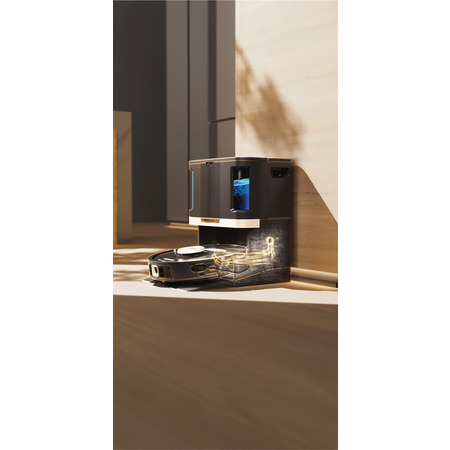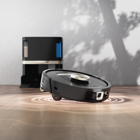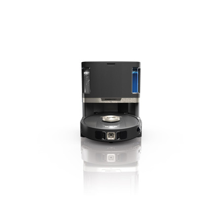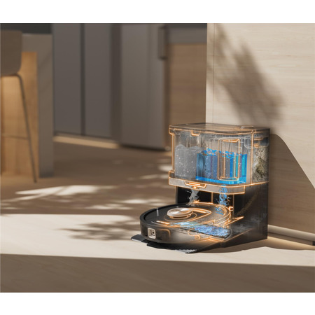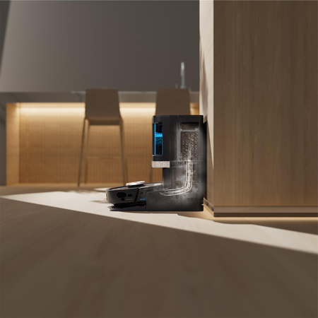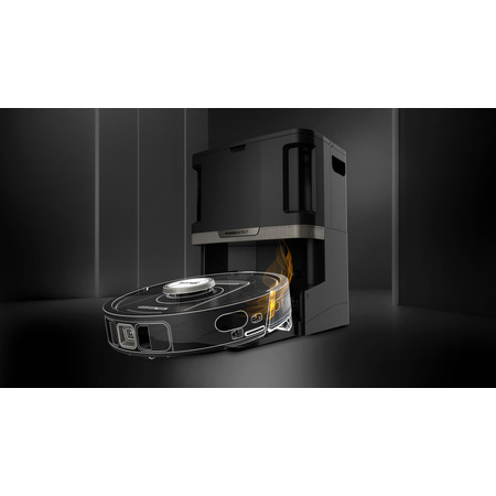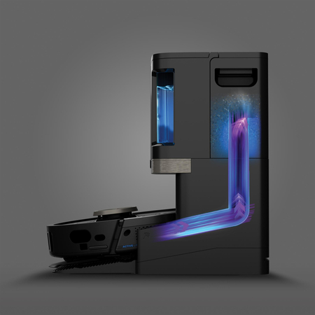 После каждого цикла робот возвращается на базу, автоматически очищающую его внутренний контейнер без мешка. База способна хранить мусор до 60 дней, что уменьшает потребность в ручной очистке.