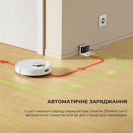 Робот-пылесос Dreame D9 MAX Gen 2С Dreame D9 MAX Gen 2 можно все. Этот топовый беспроводной помощник возьмет на себя скучную рутину и сделает все как профи. Здесь вы в одном флаконе получите комбинацию влажной и сухой уборки. А результат магической уборки не заставит себя ждать: ноль пятен и разводов, и никаких пропущенных зон. Что круто благодаря умному датчику пылесоса не грозит застревание или столкновение с мебелью на пути. А с приложением вы сможете свободно планировать чистоту по графику и, конечно, настраивать стратегии уборки и целевые зоны именно так, как удобно.Особенности:4 часа автономной работы с батареей на 5200 мАчМощное всасывание до 6000 ПаКонтейнер для пыли на 570 млПродвинутая навигация с датчиком LiDAR6000 Па - лучшая мощность всасыванияПылесос имеет на вооружении современный бесщеточный двигатель Nidec и воздушные потоки с оптимальной конструкцией. И поэтому генерирует высокую силу всасывания с легкостью устраняет самую сложную грязь. А чтобы вы могли настроить параметры и достичь безупречной чистоты, можно свободно переключаться между четырьмя уровнями всасывания.Насадка, которая умеет всеDreame D9 MAX Gen 2 может похвастаться конструктивным апгрейдом основной насадки и V-подобной щетки. Такое обновление помогает извлекать грязь с высокого ворса и сложных рельефных поверхностей. И что круто — волосы и шерсть не запутываются вокруг валика.Лучший маршрут с датчиком лидарРобот отлично "видит" пространство вокруг себя благодаря встроенному лазерному датчику LiDAR. Сканирует окружение на 360 градусов и уже после первой сессии сам строит карту вашего дома с расположением мебели и мелкими деталями. Dreame D9 MAX Gen 2 - это умник, которому достаточно один раз познакомиться с интерьером комнаты, чтобы в дальнейшем четко обходить целевые зоны, избегая препятствий.Забудьте о пыли и мусореDreame D9 MAX Gen 2 уже готов выполнить миссию "чистота" и спасти ваш дом от мусорного хаоса! Не зря он оснащен удлиненным основным валиком (16,8 см) и щеткой с V-подобным дизайном. Такая конструкция лучше захватывает мелкий мусор и микрочастицы пыли, даже если они осели в глубине ворса или в узких выемках пола.Максимум мощности на ковреРобот-пылесос знает, как сделать уборку умнее. Поэтому он автоматически включает самую высокую мощность, когда заезжает на ковровое покрытие.2 функции в одном устройствеУдобно, когда один помощник сразу выполняет два бытовых задания: влажную и сухую уборку. Робот оснастили многоразовыми протирочными салфетками, которые моют поверхность до блеска. С тремя уровнями подачи воды Dreame D9 MAX Gen 2 победит устойчивые пятна уже с первого прохода.Очищайте площадь до 224 кв. м. на одной зарядкеЗнаете, что дает аккумулятор емкостью 5200 мАч, вместительный пылесборник на 570 мл и водный резервуар объемом 235 мл? Все это - гарантия того, что вам не придется отвлекаться в процессе для зарядки, доливания воды или вытряхивания пылесборника. При этом сам гаджет без зарядки сможет поработать в течение 285 минут. А площадь, которую он успеет охватить за это время, — примерно 10 средних по размеру комнат.Управление через смартфонDreame D9 MAX Gen 2 - хитрый пылесос, который понимает вас с одного касания. Просто зайдите в мобильное приложение и выберите сценарии уборки для каждой комнаты. Там вы можете запланировать график уборки, отметить запрещенные места или запрограммировать мытье пол