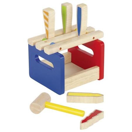 Дерев’яна лавка із молоточком і кілочками від німецького бренду goki. Дітлахам пропонується забити 5 кілочків поміж деревяних планок у лавці. Іграшка-стучалка надзвичайно корисна для дітлахів від 2-х років. Вона розвиватиме моторику рук, навчить утримувати предмети, покращить координацію рухів. Дітлахи побачать, що деякі кілочки забити легше та швидше, а деякі – довше і складніше. Іграшка повністю вироблена із екологічних та безпечних матеріалів.